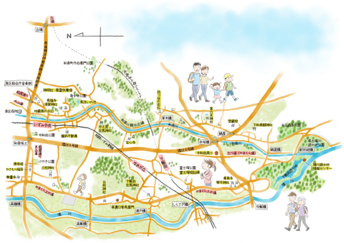観光案内などイラストで名所や特産品を入れた手描き地図を作成します。
